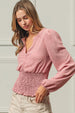 The BiBi Smocking Waist Band and Puff Sleeves Deep V Neck Top boasts a smocked waistband to flatter your figure and elegant puff sleeves, all complemented by a deep V-neckline for a stylish and feminine appearance. This versatile top combines trendy features to create a chic and adaptable piece that can easily transition from casual to formal wear. The waistband enhances the waistline, while the sleeves and neckline exude sophistication, making it a perfect choice for any occasion.
