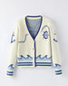 Sail into sweater weather with a playful, polished cardigan that channels yacht-club chic from desk to dock. In a creamy ivory knit trimmed in ocean blues, this women’s cardigan features intarsia anchors, a captain’s wheel, and rolling waves along the hem—finished with contrast ribbing and glossy buttons for a refined touch. Light yet cozy, it layers effortlessly over tanks, tees, and button-downs for year-round wear.