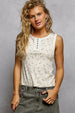 This sleeveless knit tank showcases a delicate floral print with refined construction details including a half placket closure and metal button accents. The raw-edge seams and exposed outseams create intentional texture, while vintage washing imparts an authentic, lived-in aesthetic. Cut with a slim silhouette and finished at a round neckline, the lightweight knit fabric drapes elegantly for versatile layering or standalone wear. An expertly crafted piece that balances feminine design with contemporary edge.