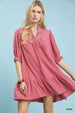 This Umgee mini dress showcases romantic elegance through its split V-neckline, soft stand collar, and intricate lace crochet yoke. Three-quarter sleeves finished with elastic ruffle cuffs provide a delicate, feminine silhouette. The tiered construction creates visual interest while the unlined construction ensures breathability and comfort. Functional side pockets offer practical appeal, making this piece equally suited for casual outings or special events. The mini length and thoughtful design details deliver a sophisticated yet approachable aesthetic for the modern wardrobe.