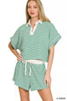 Elevate your casual wardrobe with this charming striped set that effortlessly combines style and versatility. The collared top delivers a refined, polished appearance while the coordinating shorts create a cohesive look that's perfect for any occasion. The timeless striped pattern ensures you'll reach for this set season after season. Whether you wear it as a complete ensemble or separate the pieces to mix with your existing favorites, you'll appreciate the flexibility this two-piece offers. It's the kind of wardrobe staple that works as hard as you do—casual enough for everyday wear, yet put-together enough to feel intentional and chic.